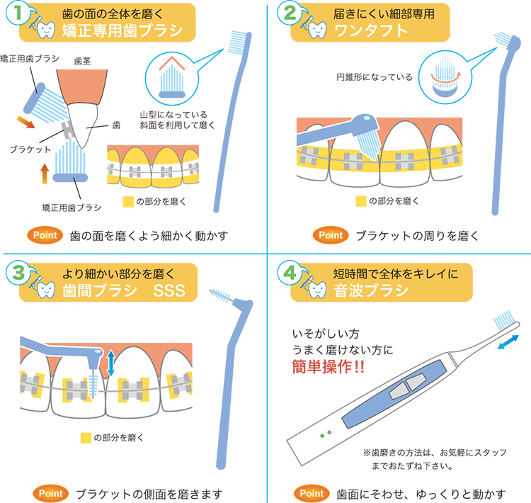 矯正装置のついている歯はとっても汚れがたまりやすい!矯正専用の歯ブラシでいつもきれいなお口にしておいてください!