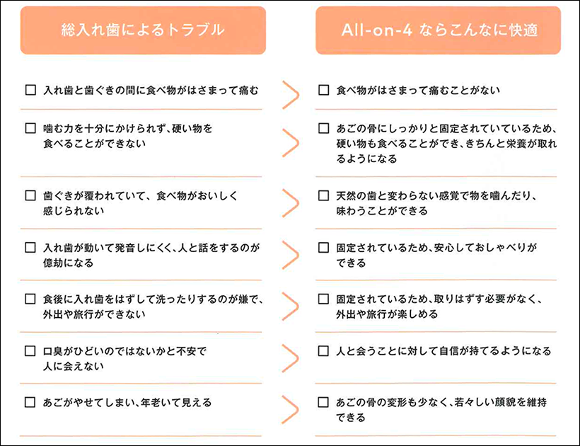 総入れ歯が外れやすい、えずいて気持ち悪い、しっかりと噛めない、というような方は多いと思います。オールオンフォーはインプラントで固定されるため、そのお悩みは解決します。